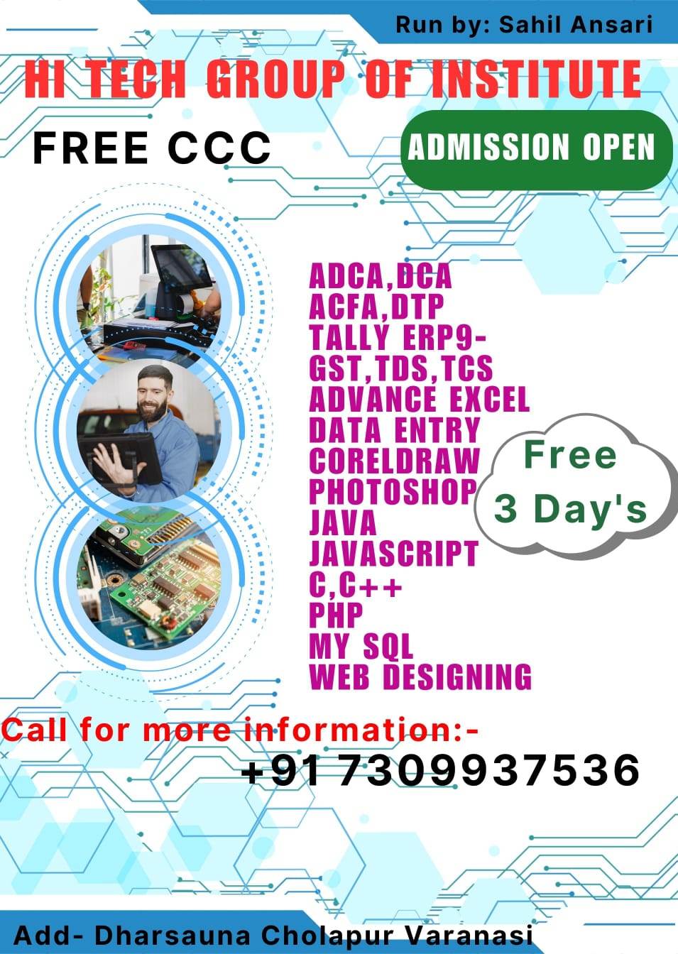 ADCA, HDCA, ADIT, MDHN, ADHN, DOM, DDTP, DFA, DTP, CFA, CCC, CCA, HDN, English Spoken, Digital Marketing, Computer Teacher Training Course, Mobile Repairing, Laptop/PC Repairing, Printer Repairing, Beautician